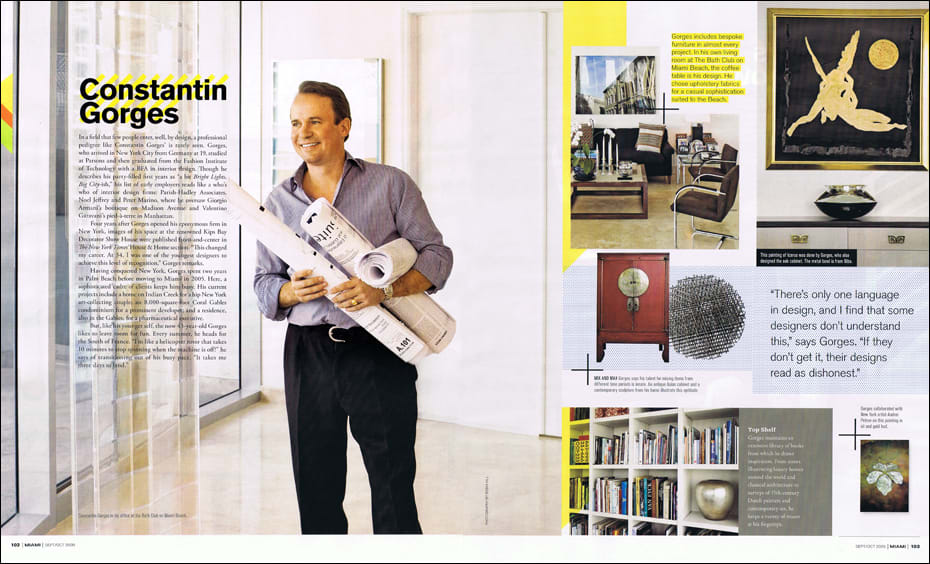 “This changed my career. At 34, I was one of the youngest designers to achieve this level of recognition,” Gorges remarks. Having conquered New York, Gorges spend two years in Palm Beach before moving to Miami in 2005. Here, a sophisticated cadre of clients keeps him busy. His current projects include a home on Indian Creek for a hip New York art collecting couple; and 8000 square foot Coral Gables condominium for a prominent developer; and a residence, also in the Gables, for a pharmaceutical executive. But, like his younger self, the now 43 year old Gorges likes to leave room for fun. Every summer, he heads for the South of France. “I’m like a helicopter rotor that takes 10 minutes to stop spinning when the machine is off!” he says of transitioning out of his busy pace. “It takes me three days to land."
