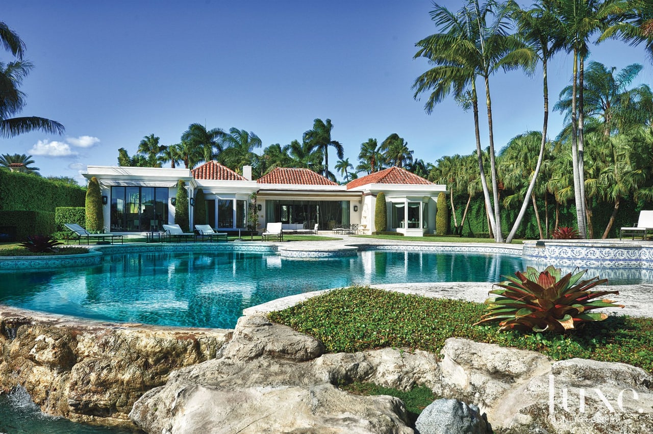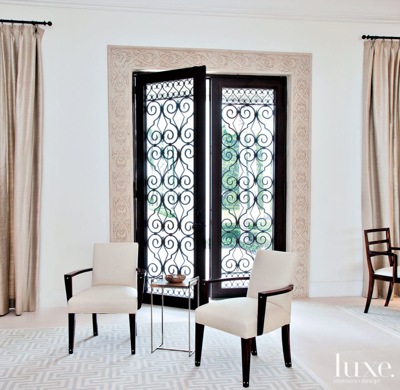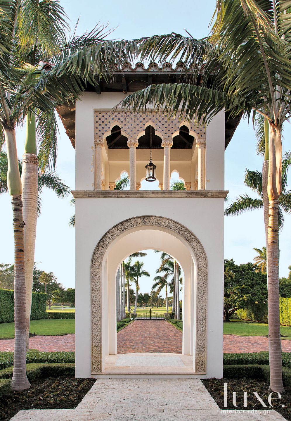 The property boasted a lovely curved pool and palms outside; landscape architect George Keen supplemented the scenery with indigenous tropical plants and more palm trees, and replaced the existing brick hardscapes with Dominican keystone. The final conundrum was a tower in front of the house in a style Gorges calls Mediterranean Moorish, an Alhambra-influenced piece of entry architecture that had been added in a previous renovation. “We debated whether or not to keep it,” says Gorges. “In the end, we decided to preserve it because of its scale.” Like the exterior, the interior reflects a design sense from many time periods, and it ought to last through many more, says Gorges: “This kind of transitional look doesn’t go out of style.”