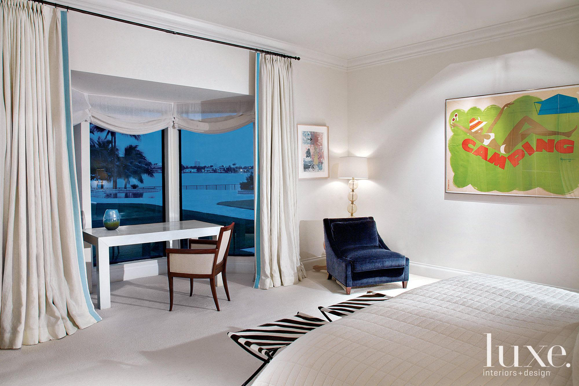 For the interior aesthetic, Gorges wanted a look that expressed the sophistication of the couple: New Yorkers who have affiliations with the arts. “The look is transitional—not contemporary, not traditional,” the designer says. He wanted a pristine look that was not overly done, with hints of color to warm the overall scheme and complement their extensive art collection. The designer chose natural tones—ecrus and soft blue-greens—and interrupted them with hues that reflected the surrounding sea: royal blue in the library and navy in the master bedroom. He then added contrast with flashes of ebony or chocolate brown, such as the sofa in the living room, that give the design a rootedness. “It’s a soothing, natural juxtaposition of color,” he says. “It results in a very timeless look.”